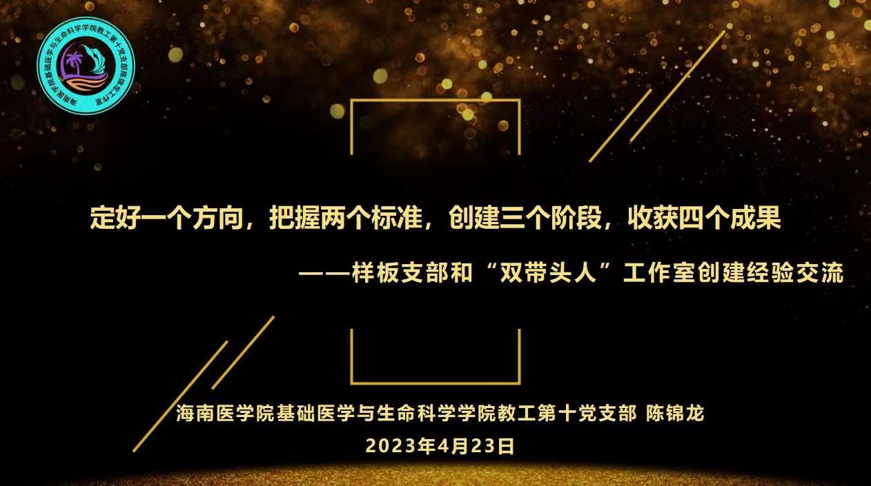 第十党支部书记陈锦龙以“定好一个方向,把握两个标准,创建三个阶段,收获四个成果”为主题分享党支部在创建“全国党建工作样板支部”和“海南省双带头人”工作室方面的经验。