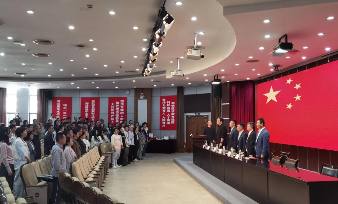 会上,全体教职工起立齐唱国歌。