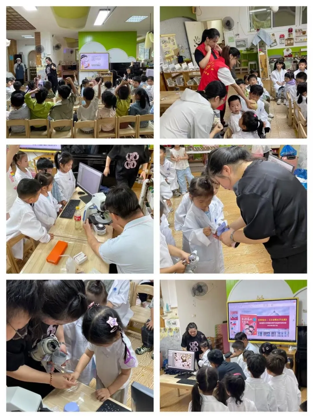 活动现场,项丹老师以《主动喝水不生病》绘本为切入点,巧妙引出了病原微生物的主题。她生动有趣的讲解瞬间吸引了小朋友们的目光,激发了他们对微生物的浓厚兴趣。在科学实验环节,孩子们展现出了极高的热情,他们通过显微镜仔细对比观察了脏水和自己水杯中的水,直观地发现了两者之间的差异,亲身体验到了科学探索的乐趣。此次活动不仅丰富了幼儿的科学知识,更通过寓教于乐的方式,引导孩子们养成讲卫生的健康生活习惯,为他们的健康成长增添了亮丽的一笔。