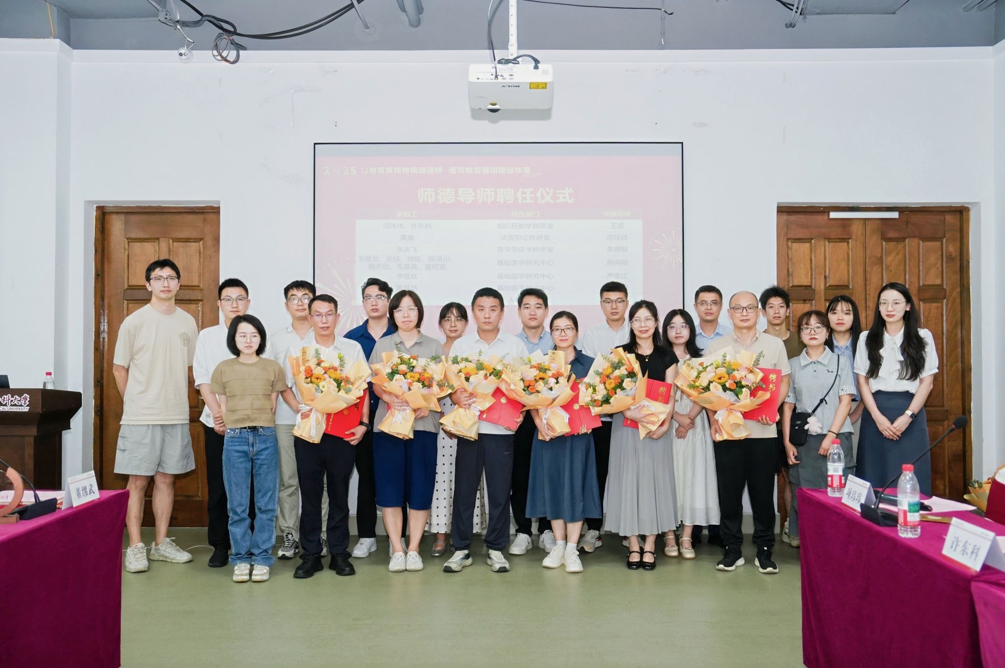 为他们配备了师德导师。郑飞中书记为受聘的师德导师颁发证书,新教工代表向导师献花,表达对导师的尊敬。聘任师德导师将充分发挥优秀教师的示范引领作用,帮助新教工快速适应岗位,提升师德素养与教学能力,助力青年教师成长。
