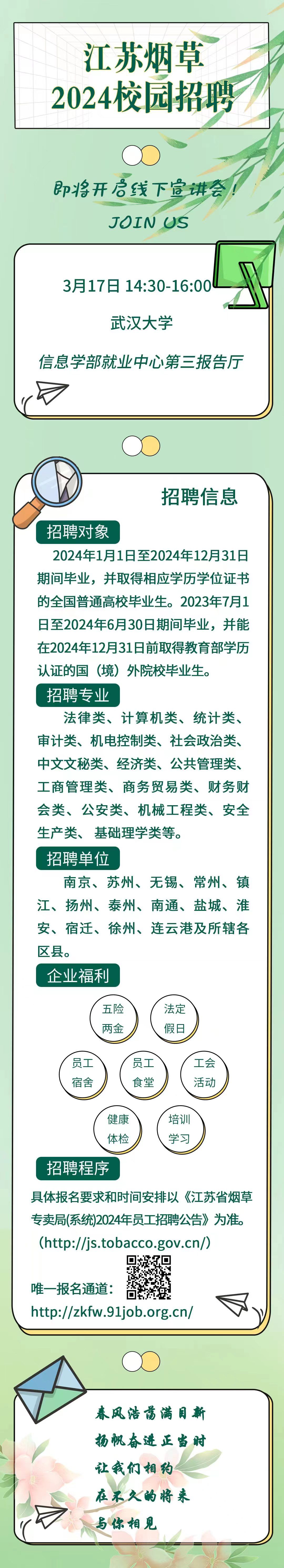 就业中心第三报告厅 3月17日 14:30 | 江苏烟草2024校园招聘