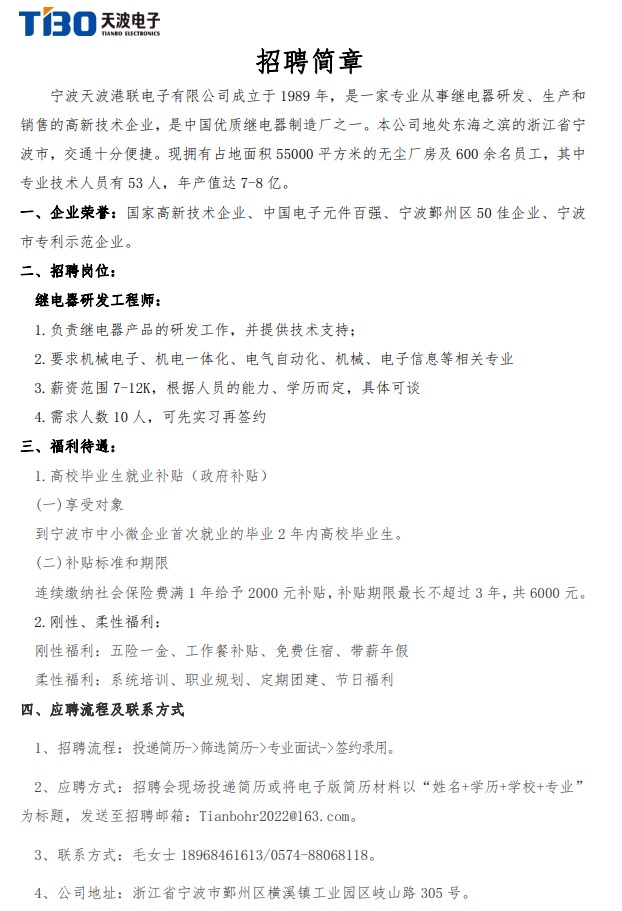 宁波天波港联电子有限公司招聘
