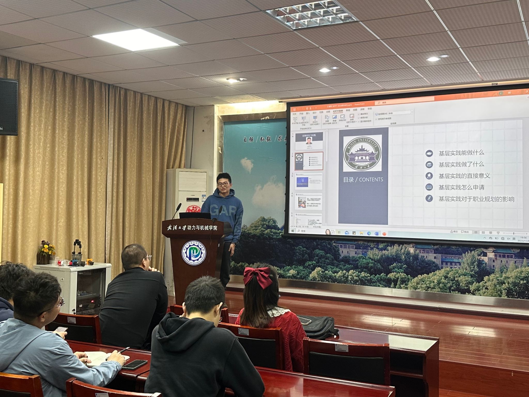 王雷阳从自身经历开始讲起,为同学们分享了基层政务实践的具体工作内容。他表示,大学生成长要勤于实践,在实践中不断学习总结,逐步完善,并有所创新。他认为基层政务实习是一个能够快速增长社会经历,贴近基层群众的好途径。他通过自身经历向大家分享了在基层工作的感悟,并对在实习过程中发现的一些问题做了探讨,加深了同学们对政务实习的了解和对基层工作的认识。最后,王雷阳鼓励广大动机学子充分把握校内资源,积极观察,主动实践,深入实地考察我国的基层治理运行模式,了解基层工作者现状,在实践中锻炼政务处理能力,在历练中打磨初心与自我。