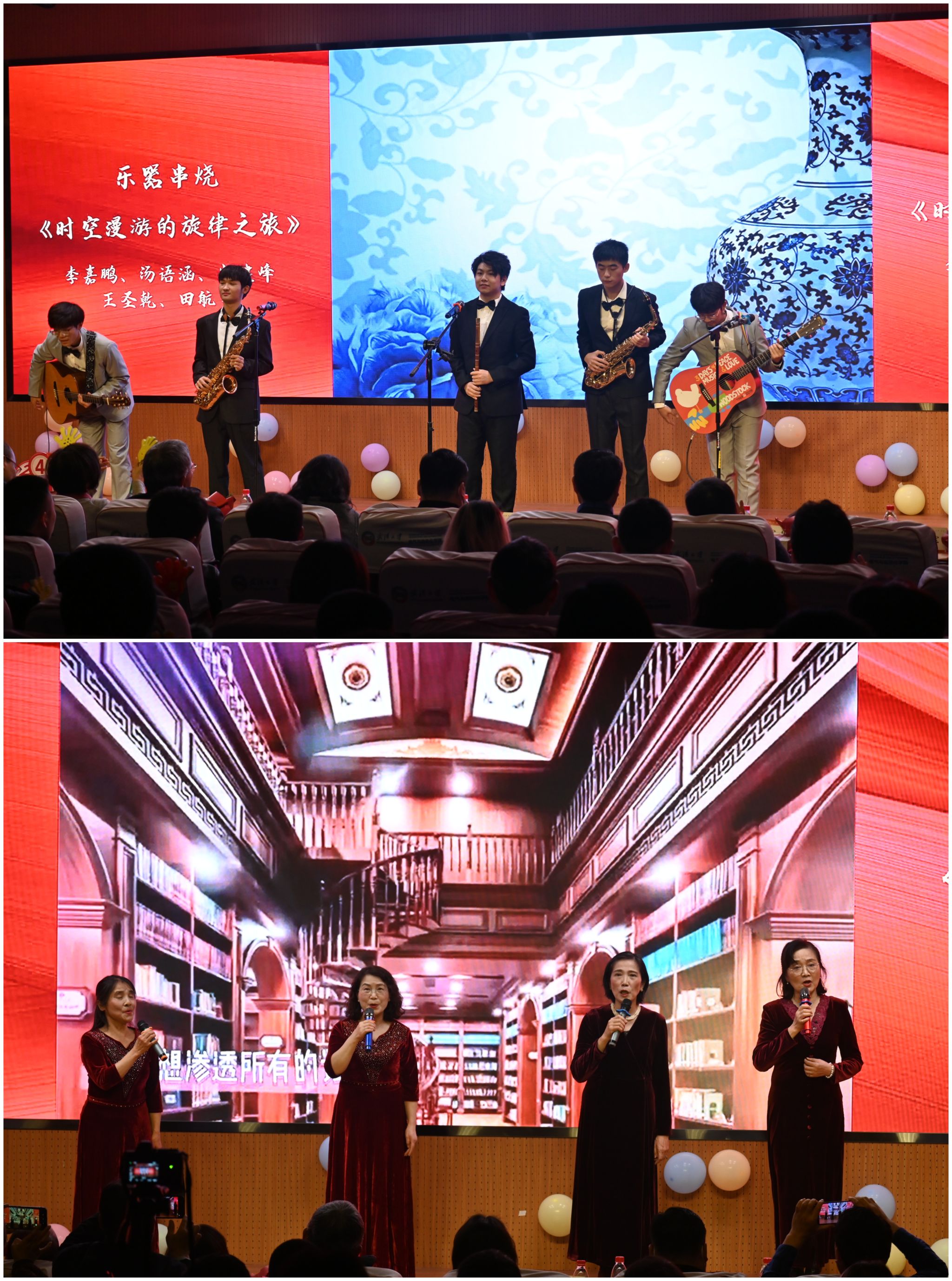 联欢会现场,学院师生给大家带来歌曲合唱《团结就是力量》、《水手》、《同一首歌》,影子舞《快乐园丁》、乐器串烧《时空漫游的旋律之旅》、古筝串烧演奏、吉他弹唱《最伟大的作品》、舞蹈《DUN DUN》、三句半《2023动机新闻集锦》、歌曲串烧《你曾是少年》等丰富多彩的节目表演,呈现了一场精美绝伦的视听盛宴。除了精彩的节目,联欢会还设置了趣味的活动环节和刺激的抽奖环节,互动游戏《舞蹈动作接力》让整个会场欢笑不断,小游戏《赛马》让每一位观众都参与其中,丰富的奖品让所有师生都沉浸在这份欢乐和惊喜之中。
