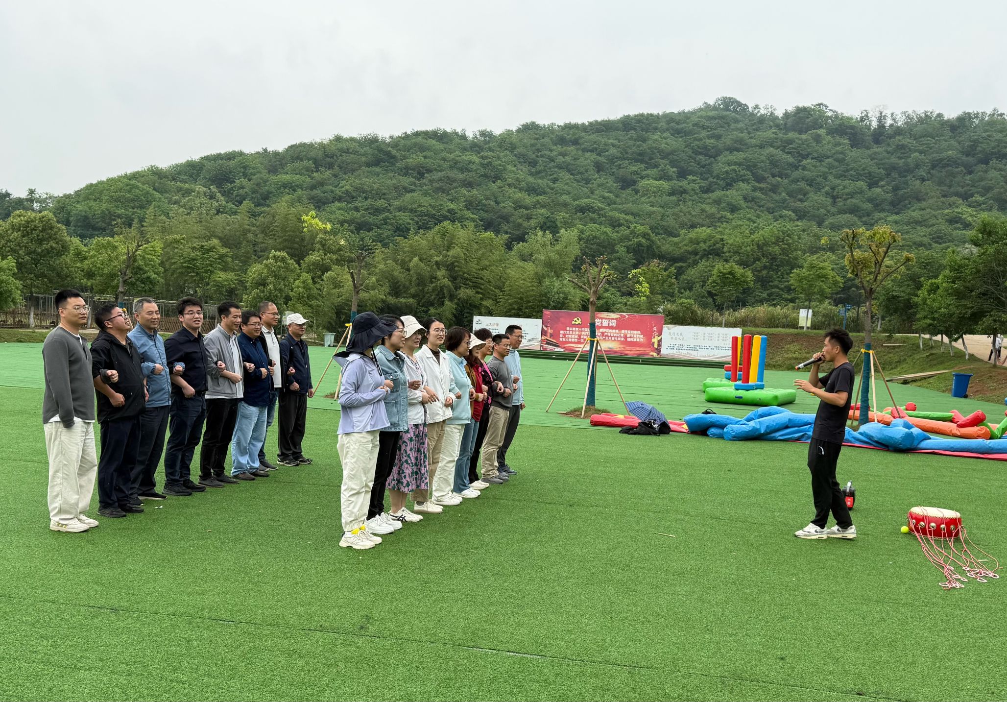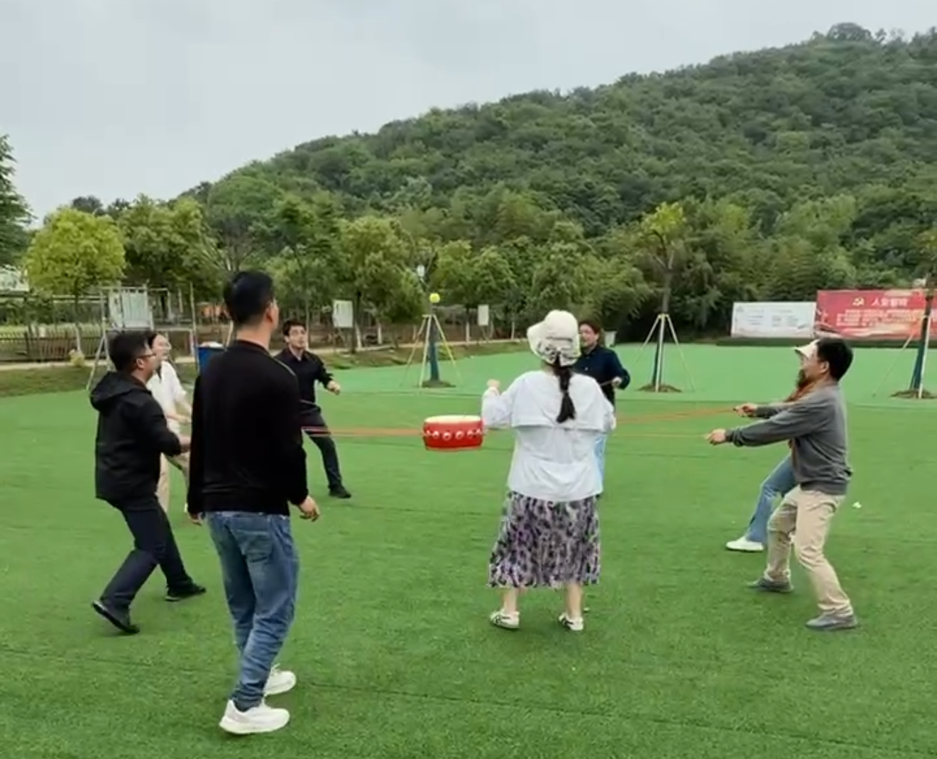 午餐过后,紧张刺激的团建游戏拉开帷幕。“头脑风暴” 中,老师们要迅速做出与教练指示相反的动作,这个游戏非常有趣,一次次做错的动作引起了一阵阵笑声;”击鼓颠球“游戏,大家齐心协力,紧握绳索,紧盯弹起的小球,争取2分钟内接住更多的球,充分展现了团队协作精神;“旱地龙舟” 游戏更是将活动氛围推向高潮,各小组高喊口号,用最快最整齐的步子冲向终点。在游戏过程中,老师们相互鼓励、相互支持,进一步加深了彼此间的了解与信任。