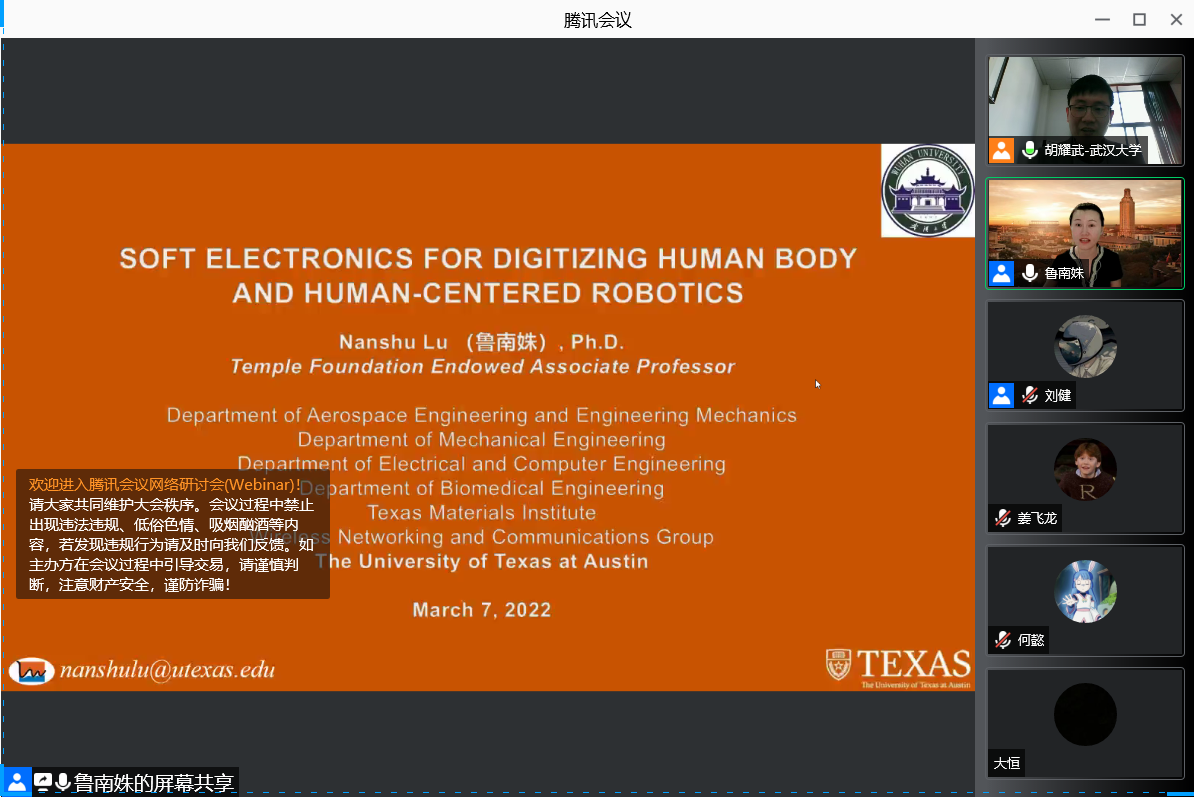 本网讯(通讯员:尚瑨 编辑:陈飏 审核:胡耀武、刘泽庭)3月7日中午,美国德州大学奥斯汀分校力学/机械等院系教授鲁南姝在杏吧 通过线上会议的形式,举行“用于人体数字化和智能仿生机器人的生物电子元件”学术研讨会,学院副院长胡耀武及部分师生参加了本次研讨会,本次研讨会由胡耀武主持。