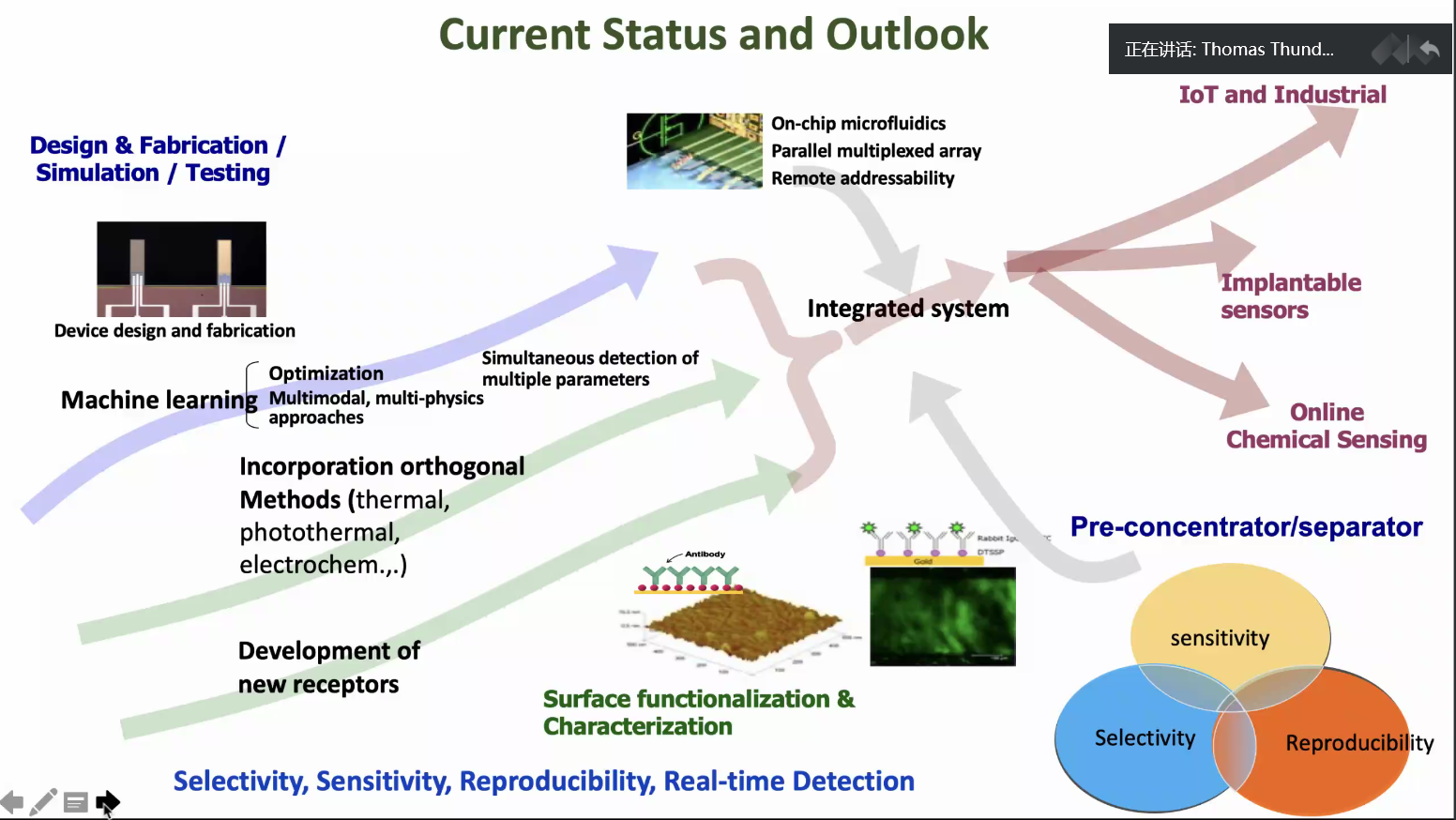 随后,Thomas Thundat介绍了MEMS传感器的特点,其与红外光谱法、编程热解吸法和电化学法等技术的结合有广泛的应用前景,提高了纳米机械红外量热光谱法的灵敏度和检测时间,通过机器学习,能够在复杂的环境中实现分子识别。Thomas Thundat也讨论了基于MEMS的化学和生物传感器中提高化学选择性和重现性的最新进展,介绍了使用Tesla的谐振电力输送方法为传感器网络输送电力的最新发展。